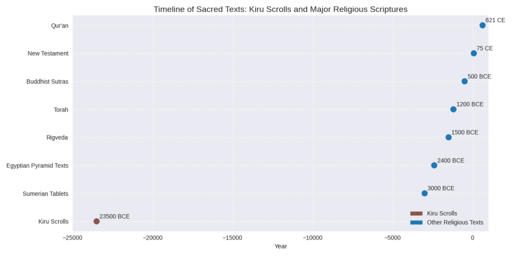 Here’s a timeline showing just how ancient the Kiru scrolls are compared to other major religious texts. Their estimated origin — between 22,000 and 25,000 BCE — places them tens of thousands of years before the earliest known scriptures from Sumer, Egypt, India, and the Abrahamic traditions.
